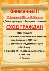 Примария и сельский совет села приглашают всех жителей Авдармы принять участие в сходе граждан. Мероприятие состоится в воскресенье 23 февраля, в Доме культуры села Авдарма. Свои отчеты представят примар села и руководители муниципальных предприятий.