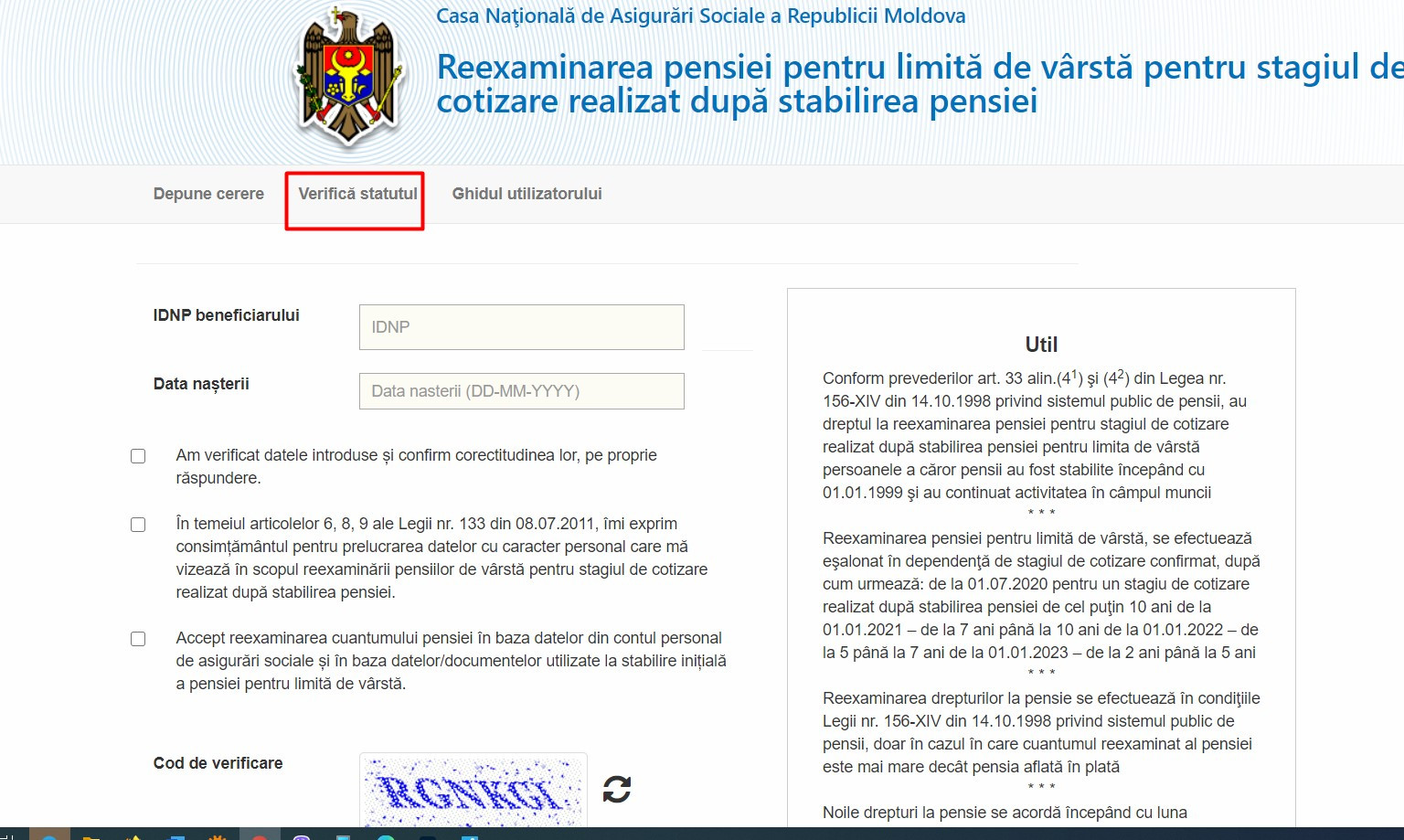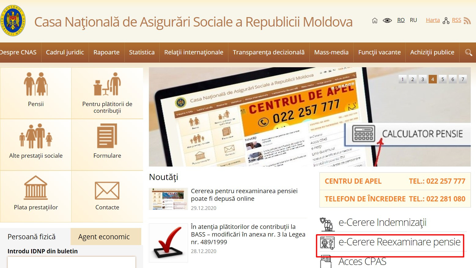 Для того, чтобы подать онлайн-заявление на перерасчёт пенсии нужно зайти на сайт www.cnas.md в раздел «е-Заявление Reexaminare pensie», ввести персональный код (13 цифр), дату, месяц и год рождения и отправить заполненную форму. В этом случае приходить лично и приносить какие-либо документы в ТКСС не надо.