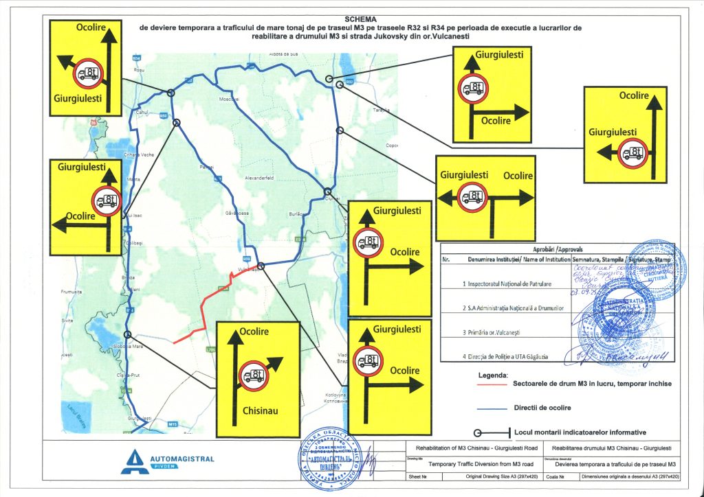 Национальная администрация автомобильных дорог сообщает, что в связи с проведением ремонтных работ на дороге М3 (выезд из города Вулканешты в направлении села Джурджулешты) и улице Жуковского в городе Вулканешты, движение большегрузных транспортных средств через город Вулканешты по трассе М3 будет временно ограничено.