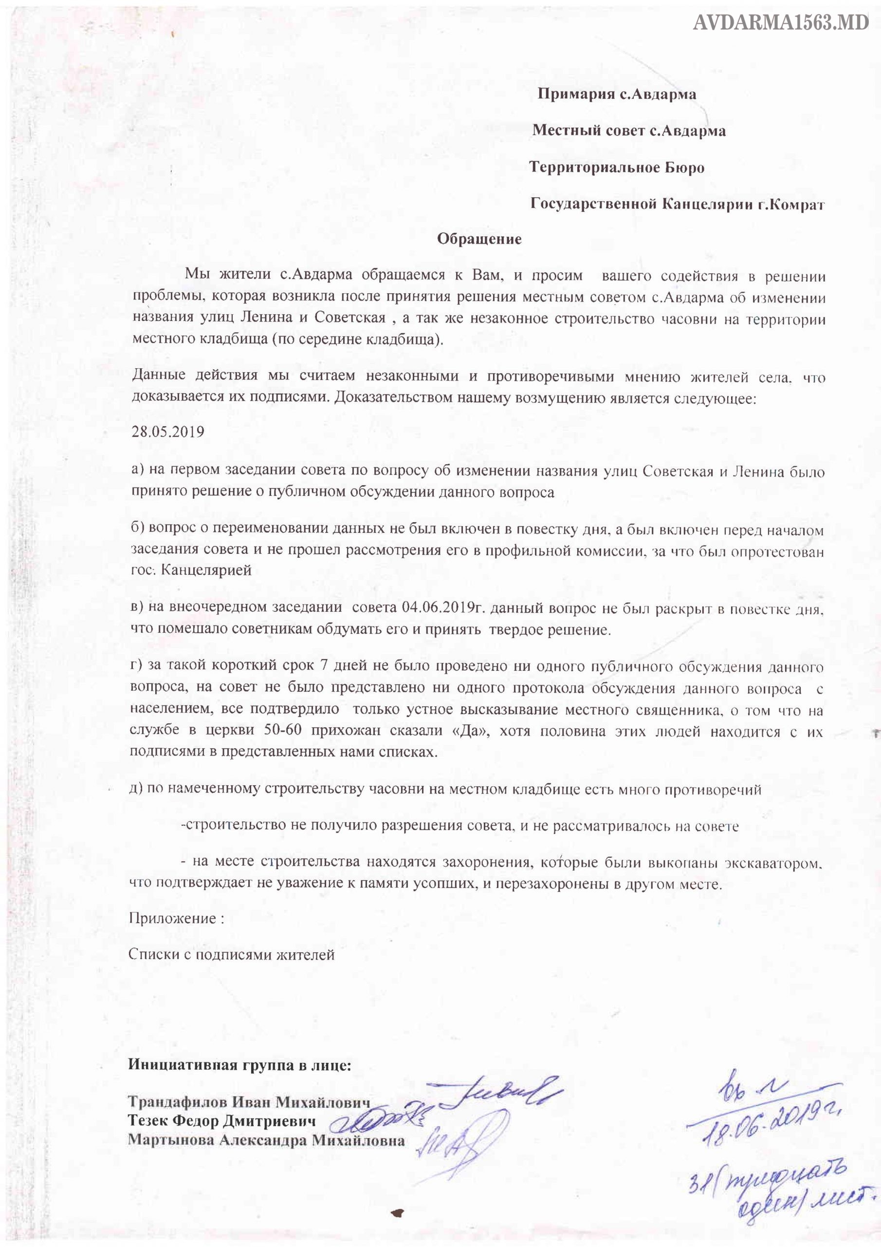По просьбе примара редакция avdarma.md публикует текст обращения инициативной группы, чтобы жители Авдармы ознакомились.