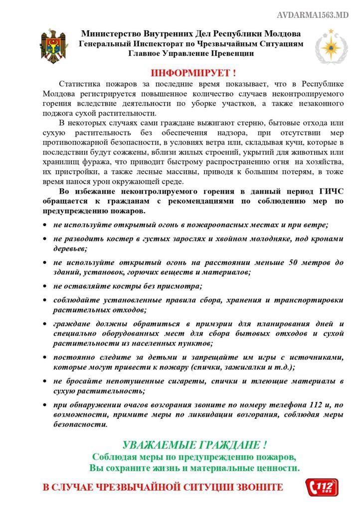 Генеральный инспекторат по Чрезвычайным ситуациям просит граждан соблюдать правила пожарной безопасности