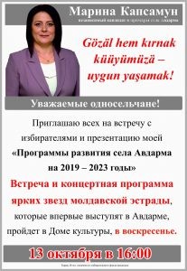 13 октября, независимый кандидат в примары села Авдарма Марина Капсамун проведет встречу с избирателями и презентует жителям свою «Программу развития села Авдарма на 2019-2023 годы».