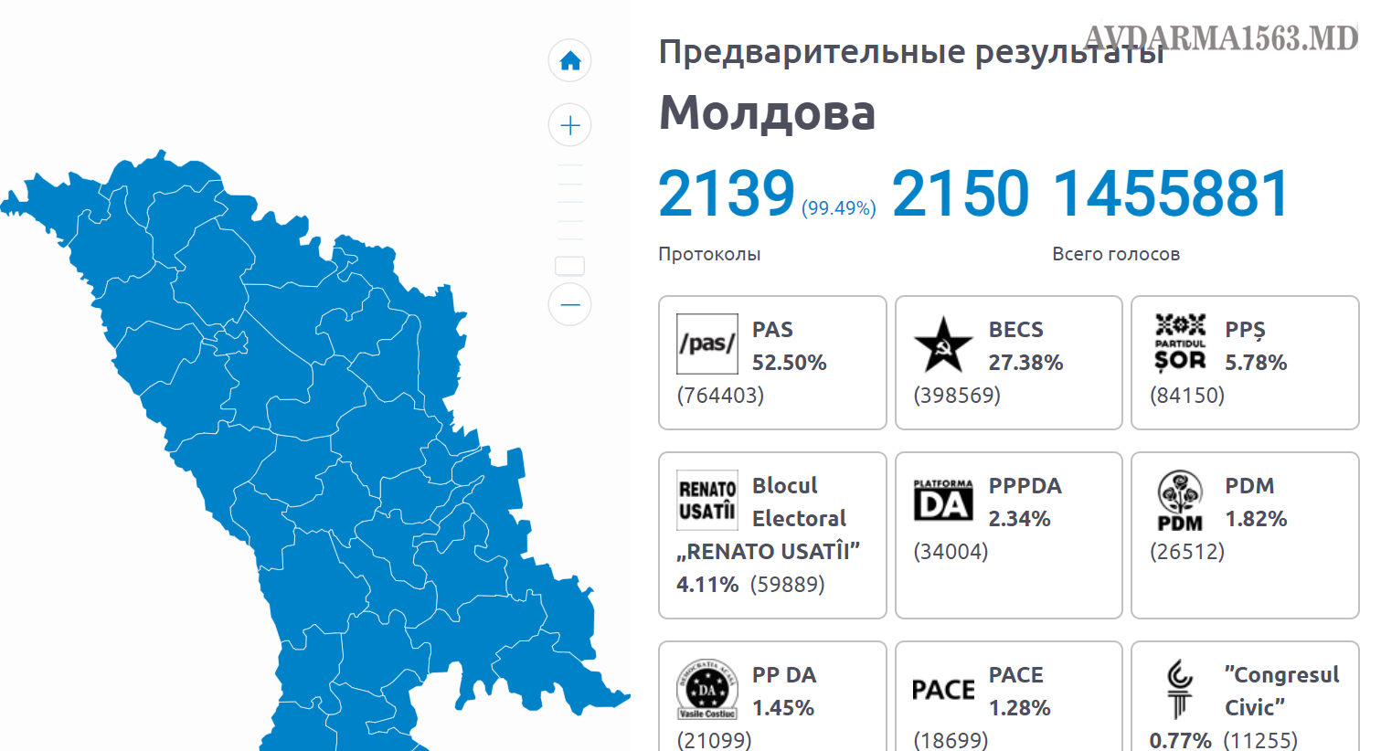 По итогам обработки 99,49 % протоколов с 2139 избирательных участков, Партия «Действие и солидарность» (PAS) получает свыше 52 % голосов. На втором месте, по данным ЦИК, оказался предвыборный блок Партии социалистов и Партии коммунистов (ПСРМ-ПКРМ) набравший 27, 38 % голосов. Третье место досталось партии «Шор», за которую проголосовали 5, 78 % избирателей.