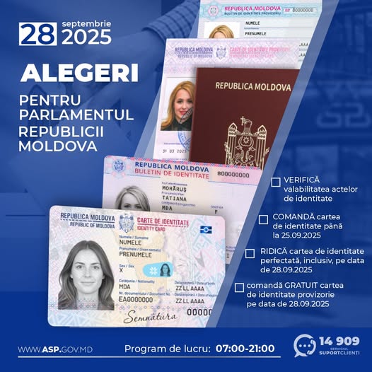 Агентство государственных услуг сообщает, что в воскресенье, 28 сентября 2025 года, в день парламентских выборов, все территориальные подразделения учреждения будут работать по особому графику с 7.00 до 21.00, передает Молдпрес.