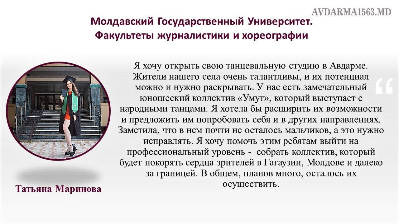 После окончания 12 класса перед молодыми авдарминцами стоит выбор будущей профессии и жизненного пути. Чаще всего выпускники авдарминского теоретического лицея поступают в учебные заведения Гагаузии и Молдовы, однако есть и желающие получить высшее образование за границей. А как же складывается их судьба после окончания университета? Для некоторых из них жизнь в больших городах по сравнению с сельской местностью имеет больше преимуществ: достойная заработная плата, возможность профессионального роста. Однако многие уроженцы села все же желают стать полезными у себя на родине. Наша редакция решили выяснить у выходцев из Авдармы, выпускников высших учебных заведений, как они планируют продолжить свой профессиональный путь и хотят ли они вернуться в родное село.