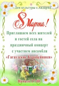 «Ежегодно, к Международному женскому дню 8 марта мы проводим праздничные концерты. В этом году, для того чтобы порадовать всех жителей села Авдарма, и в особенности женщин, мы пригласили творческий коллектив народной музыки «Гагаузские коробейники», — сказал Николай Тумба.